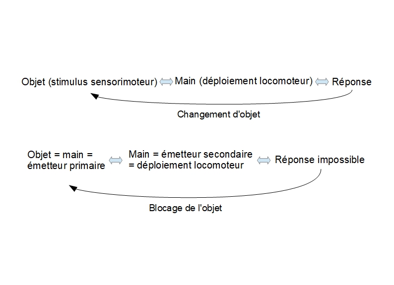 Pour cela, il est important de revenir à l’origine des capacités symboliques, telle qu’explicitée par la théorie des trois paradoxes. Notamment, si l’on rappelle de façon schématique la structure du paradoxe sensorimoteur de la main, on a le fonctionnement sensorimoteur normal suivi de sa disruption par la mise en situation de paradoxe :